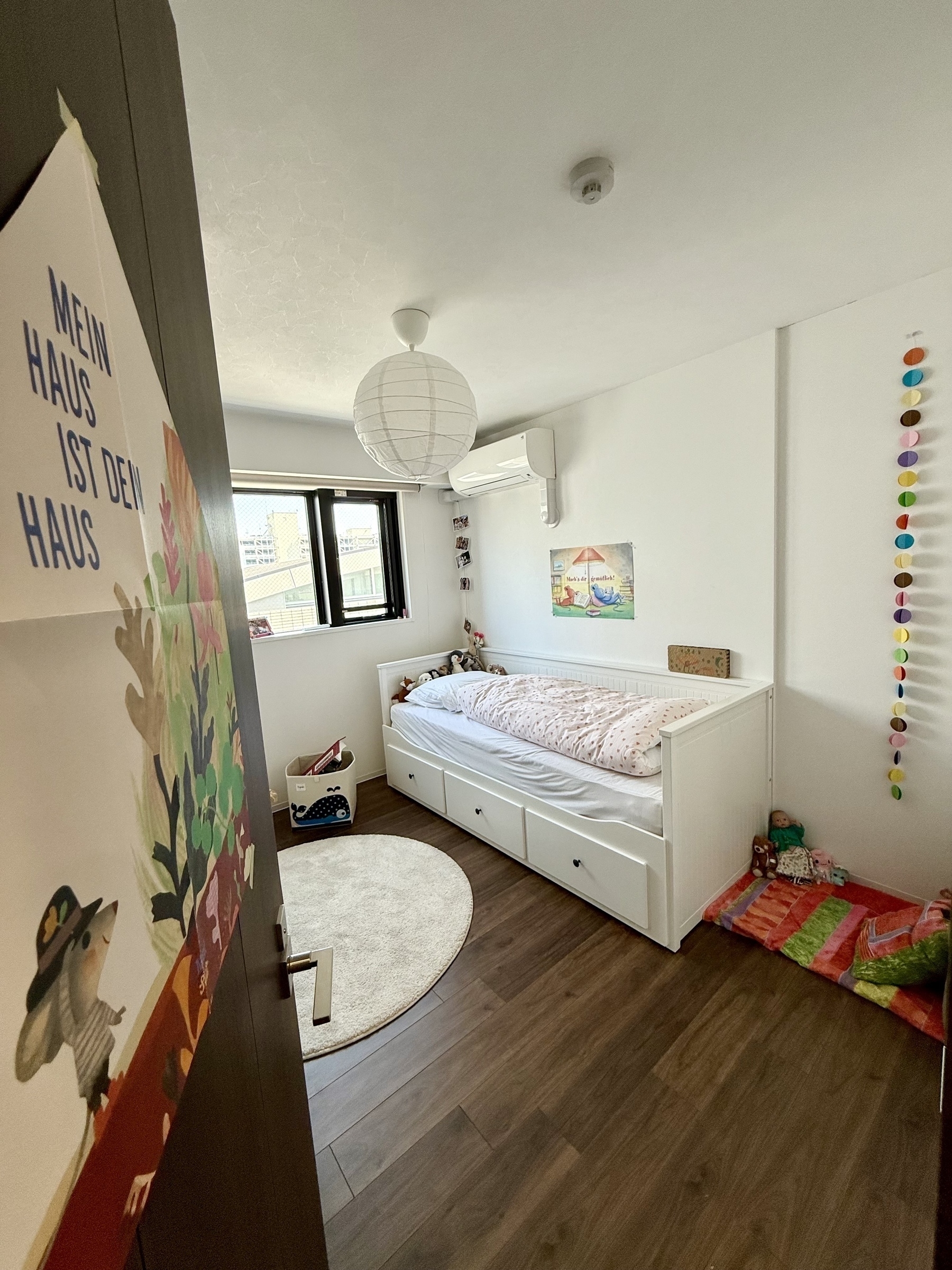 Mit dem Paket in der Hand geht’s dann in den 9. bzw. 10. Stock, die obersten Stockwerke des Gebäudes. Mathea erzählt gern, dass wir mit dem Aufzug direkt ins Schlafzimmer fahren können, tatsächlich steigen wir aber meist bereits im 9. Stock aus.